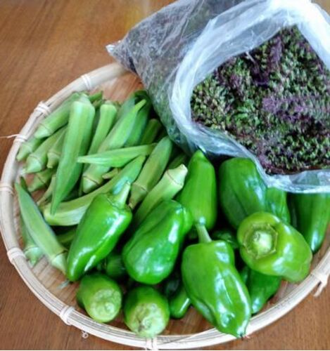 父が残してくれた家庭菜園に毎日は通えないので、育てやすくて丈夫な野菜しか作っていません。それでもどうにか育ってくれたありがたい野菜。 左からさつまいもの茎オクラ(20数本)ピーマン(16個)さつまいも・試し掘りの3個袋の中(赤と青の穂じそ) 青じそや赤…